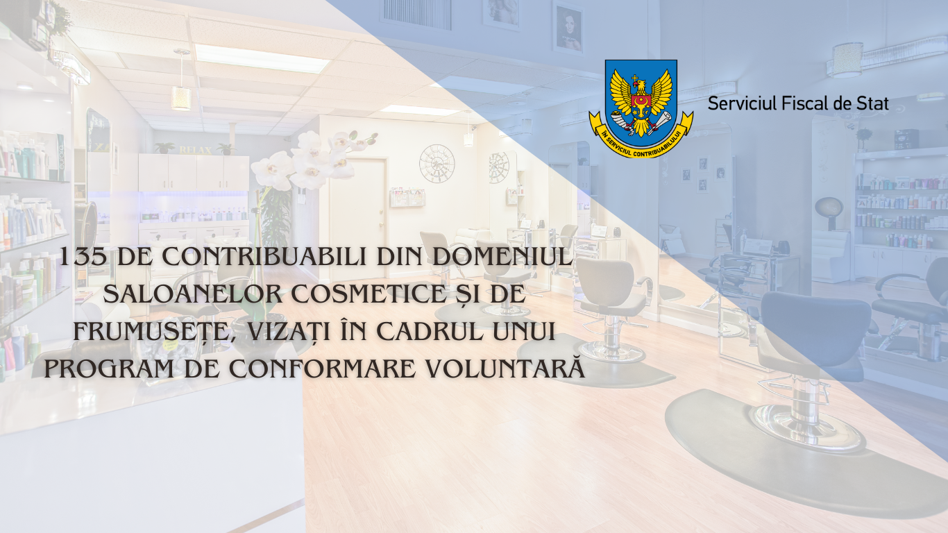 Serviciul Fiscal de Stat a aplicat măsuri de conformare voluntară, în perioada iulie-septembrie 2023, în privința a 135 de contribuabili din domeniul saloanelor cosmetice și de frumusețe, manifestate prin ieșiri la fața locului și efectuarea vizitelor fiscale, inclusiv cu familiariz