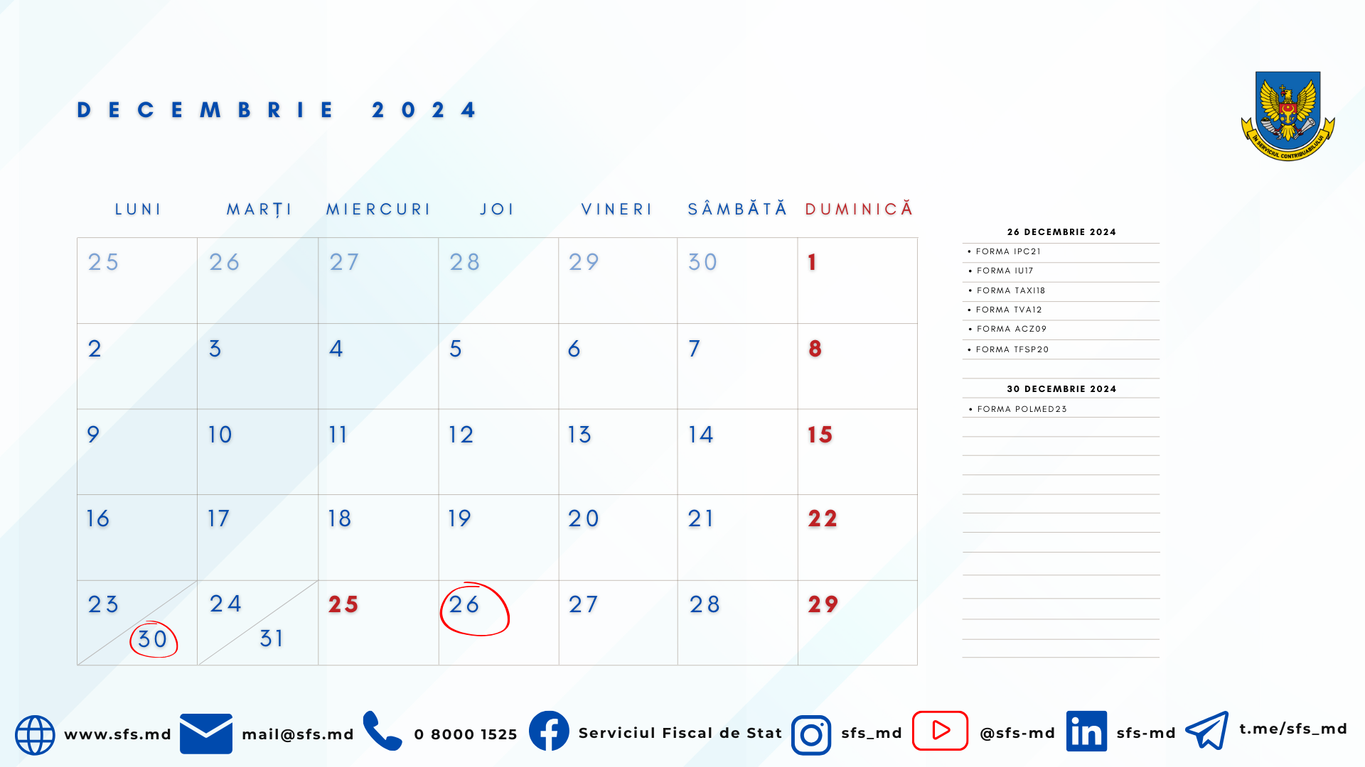 Serviciul Fiscal de Stat reamintește despre faptul că astăzi, 26 decembrie 2024, expiră termenul de prezentare a dărilor de seamă fiscale și termenul de achitare a impozitelor, taxelor, primelor de asigurare obligatorie de asistență medicală și a contribuțiilor de asigurări sociale