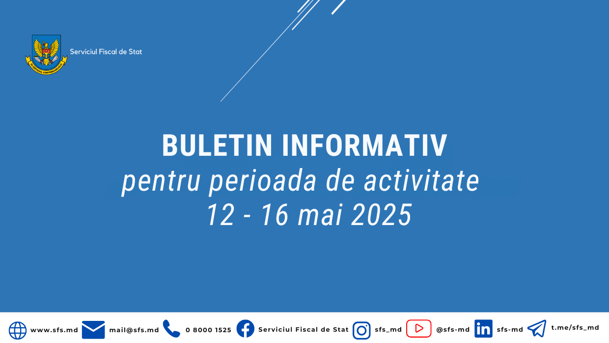 În perioada săptămânii precedente, 12-16 mai 2025, conform informațiilor operative, încasările la Bugetul public național (BPN) administrate de Serviciul Fiscal de Stat constituie circa 862,9 milioane lei. În detrimentul activităților de control, autoritatea fiscală pune un acc