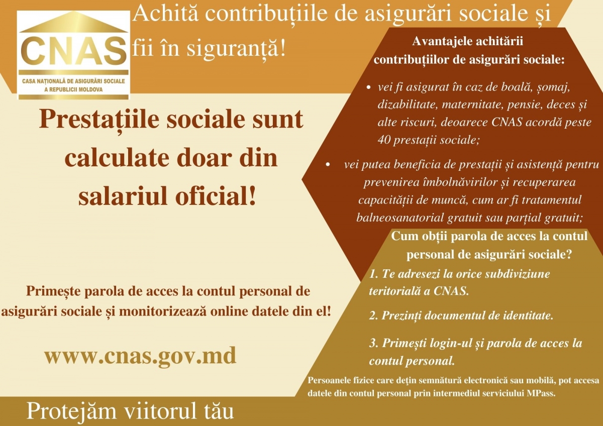 Casa Națională de Asigurări Sociale reamintește că, serviciul electronic "Acces CPAS" de pe pagina oficială www.cnas.gov.md este opțiunea ce permite oricărei persoane asigurate să monitorizeze online sta