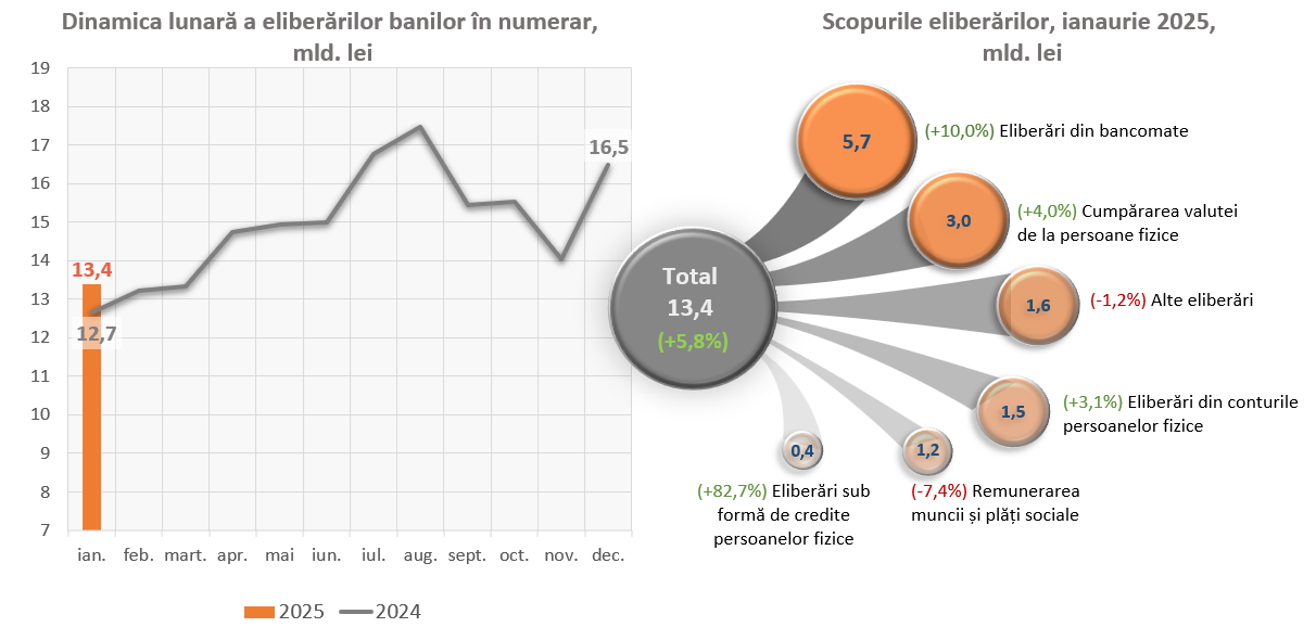 Volumul eliberărilor cumulative de numerar din casele băncilor, în ianuarie 2025, s-a majorat cu 733,3 mil. lei (+5,8 la sută) comparativ cu perioada similară a anului precedent și a constituit 13 400,8 mil. lei (Diagrama nr. 2).