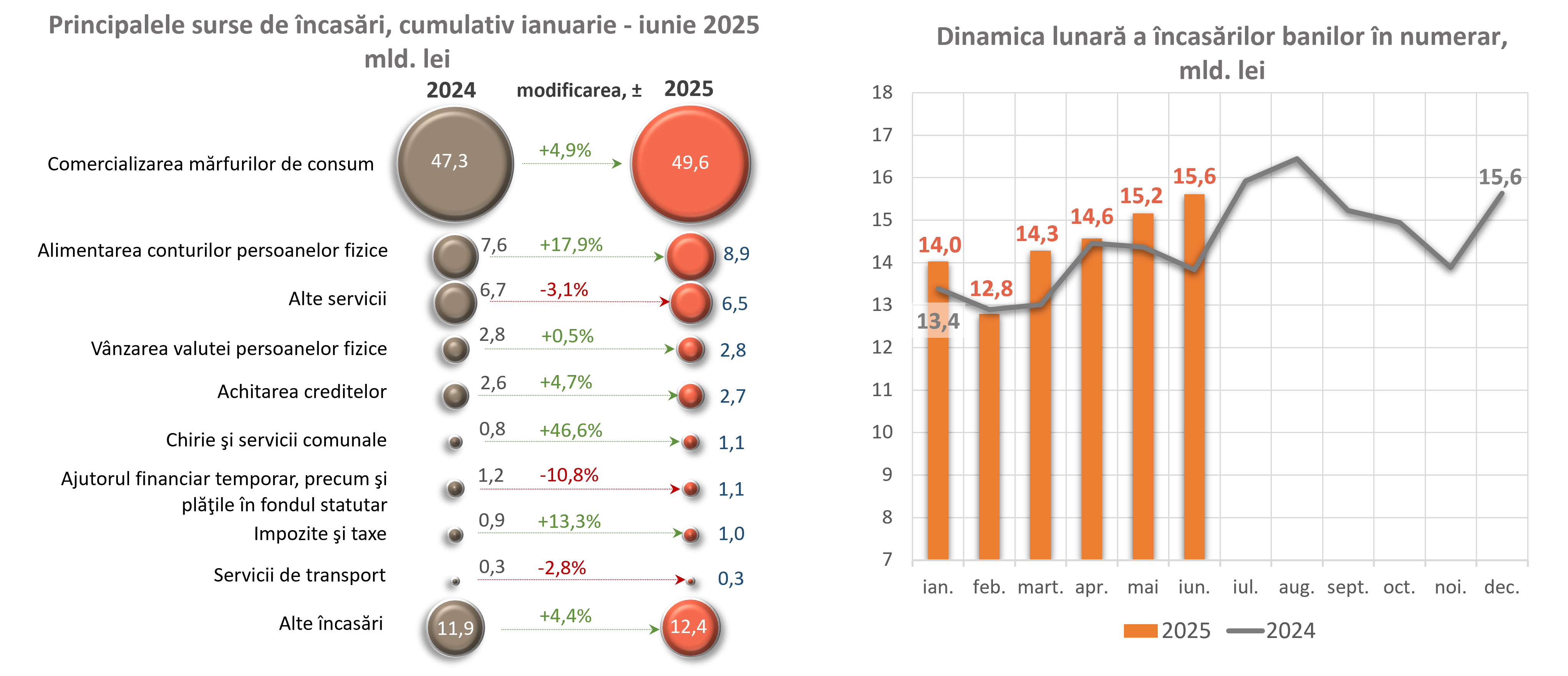 Totodată, modificarea volumului încasărilor cumulative a fost influențată și de creșterea încasărilor de numerar pe conturile curente și conturile de depozit ale persoanelor fizice de 1 356,2 mil. lei (+17,9 la sută).