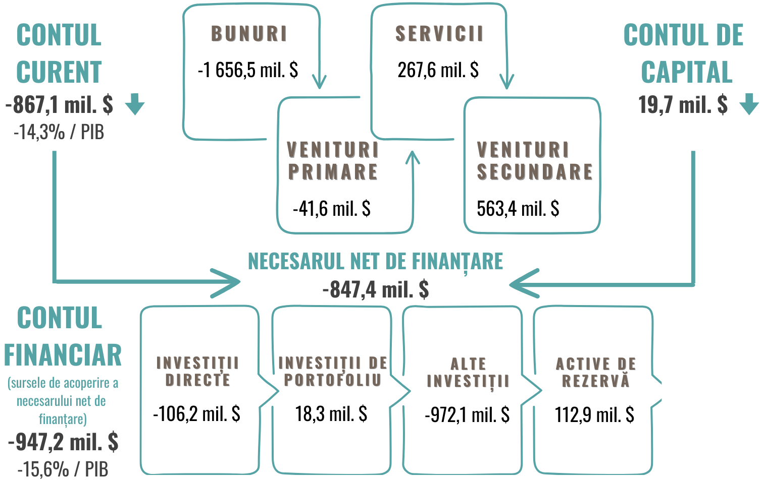 Conform datelor preliminare, în trimestrul III 2025, deficitul contului curent al balanței de plăți a Republicii Moldova a totalizat -867,12 mil. USD, diminuându-se cu 1,7 la sută comparativ cu perioada similară a anului 2024, pe seama majorărilor excedentelor înregistrate de balanțele veniturilor secundare și a serviciilor, care au acoperit cumulativ creșterile deficitelor înregistrate de balanțele comerțului exterior cu bunuri și a veniturilor primare. Raportul dintre deficitul contului curent și PIB a fost de -14,3 la sută, cu 2,6 p.p. mai puțin față de cel consemnat în trimestrul III 2024.
