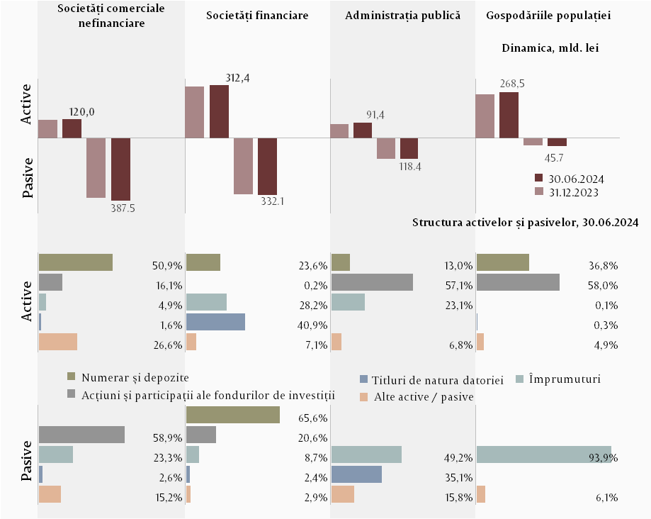 Activele sectorului gospodăriilor populației au constituit 268,5 mld. lei (+3,8 la sută comparativ cu 31.12.2023), fiind formate, în mare parte, din participațiile în capital și din numerar și depozite: 58,0 la sută și 36,8 la sută, respectiv, din totalul activelor sectorului dat. Totodată, angajamentele sectorului gospodăriilor populației au însumat 45,7 mld. lei (+7,7 la sută), fiind constituite, în principal, din împrumuturi contractate (93,9 la sută din totalul pasivelor sectorului).