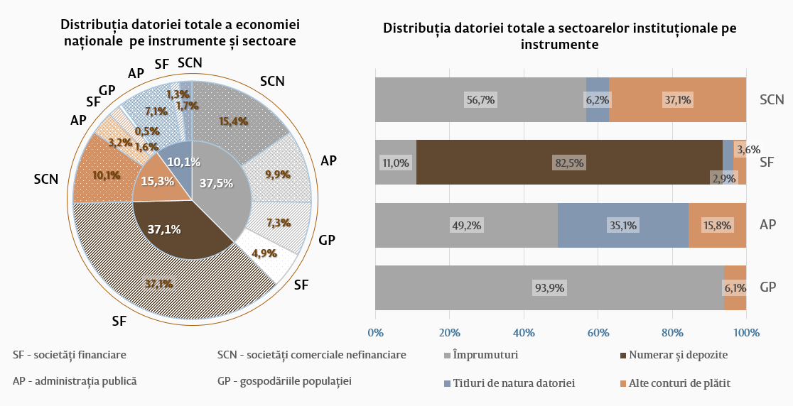 Sectoarele instituționale care au beneficiat cel mai mult de împrumuturi au fost societățile comerciale nefinanciare (40,9 la sută), administrația publică (26,4 la sută) și gospodăriile populației (19,5 la sută).