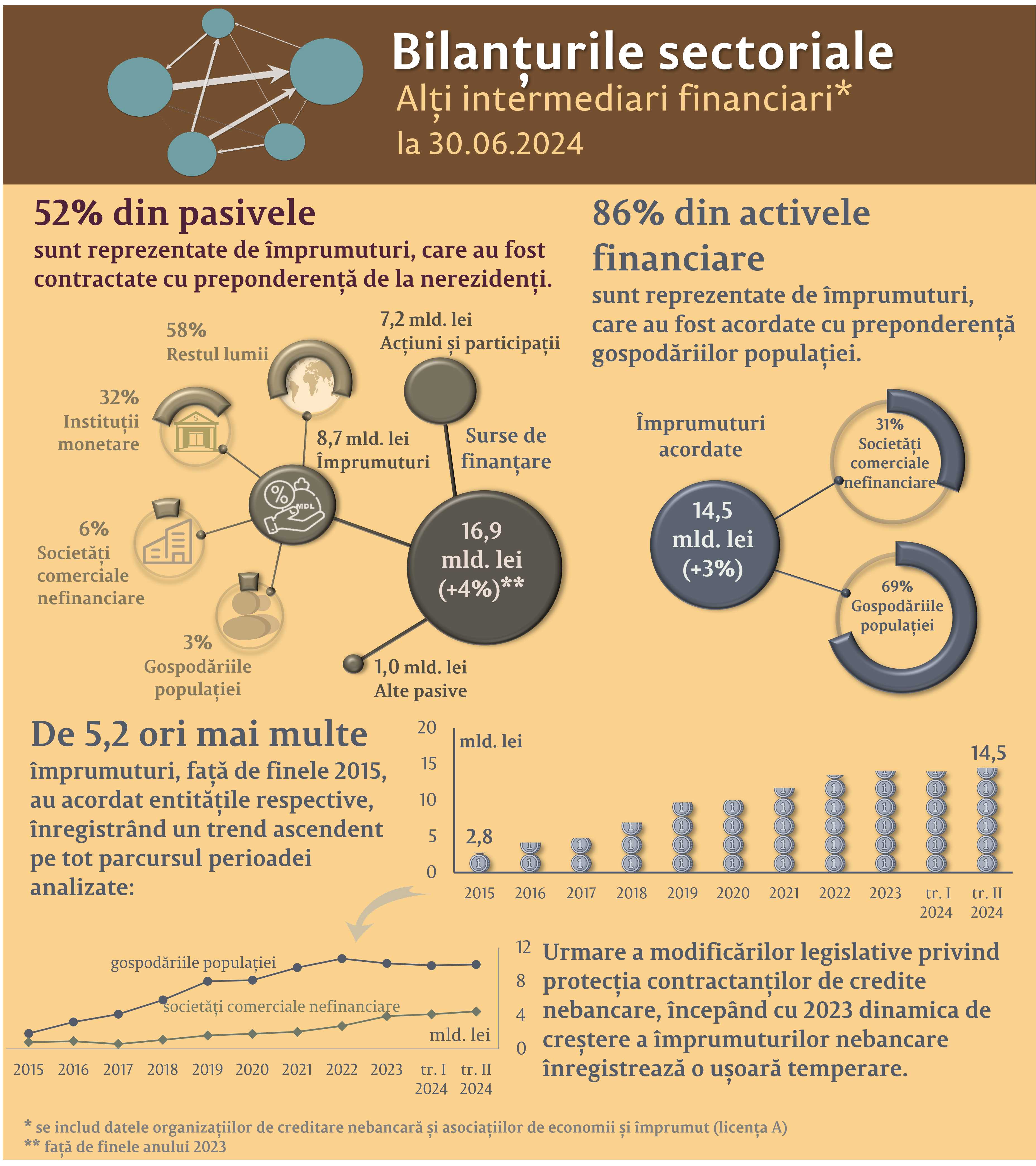 Sectorul societăților financiare a deținut active financiare în valoare totală de 312,4 mld. lei (+2,6 la sută comparativ 31.12.2023), fiind formate, preponderent, din titlurile de natura datoriei procurate (40,9 la sută), împrumuturile acordate (28,2 la sută) și numerar și depozite (23,6 la sută). Pasivele au totalizat 332,1 mld. lei, majorându-se cu 2,3 la sută. În structura acestora, partea majoră a fost deținută de numerar și depozite care a constituit 65,6 la sută.