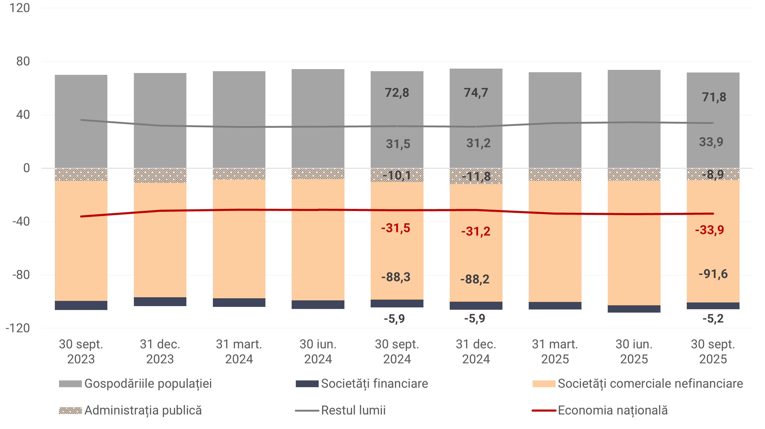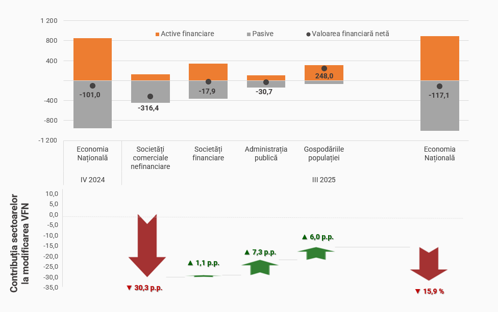 La 30 septembrie 2025 valoarea financiară netă (VFN)1 a economiei naționale a constituit -117,1 mld. lei, evoluție asociată dinamicii activelor și pasivelor financiare în trimestrul III 2025.
