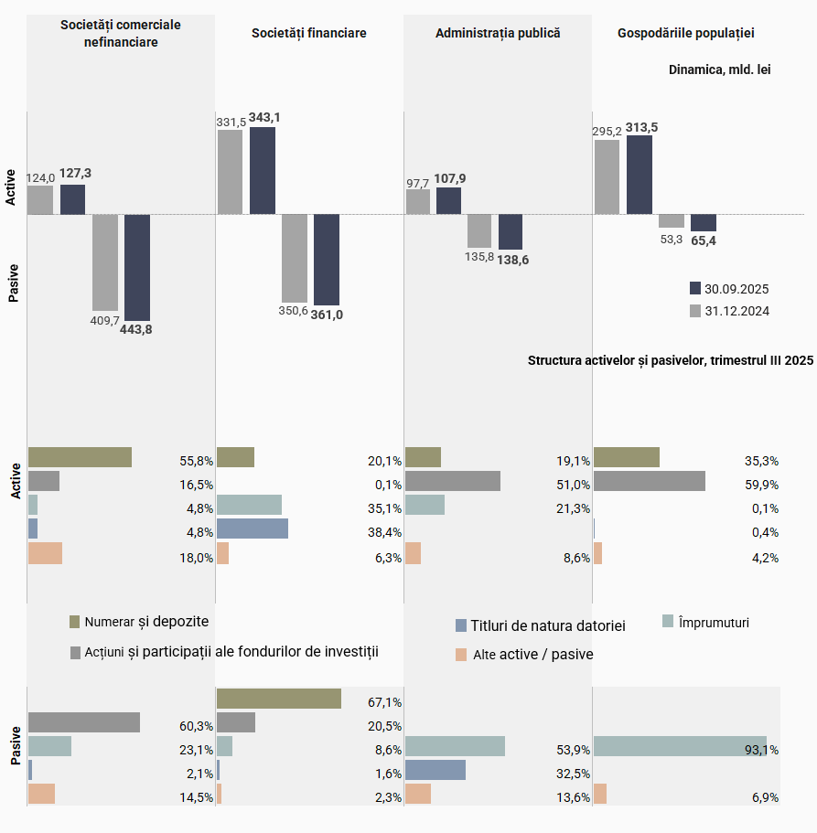 Activele sectorului gospodăriilor populației au constituit 313,5 mld. lei (+6,2 la sută comparativ cu 31.12.2024), fiind formate, în mare parte, din participații în capital și numerar și depozite, având o pondere de 59,9 la sută și 35,3 la sută, respectiv, din totalul activelor sectorului dat. Totodată, angajamentele sectorului gospodăriilor populației au însumat 65,4 mld. lei (+22,8 la sută), fiind constituite, în principal, din împrumuturi contractate (93,1 la sută din totalul pasivelor sectorului).