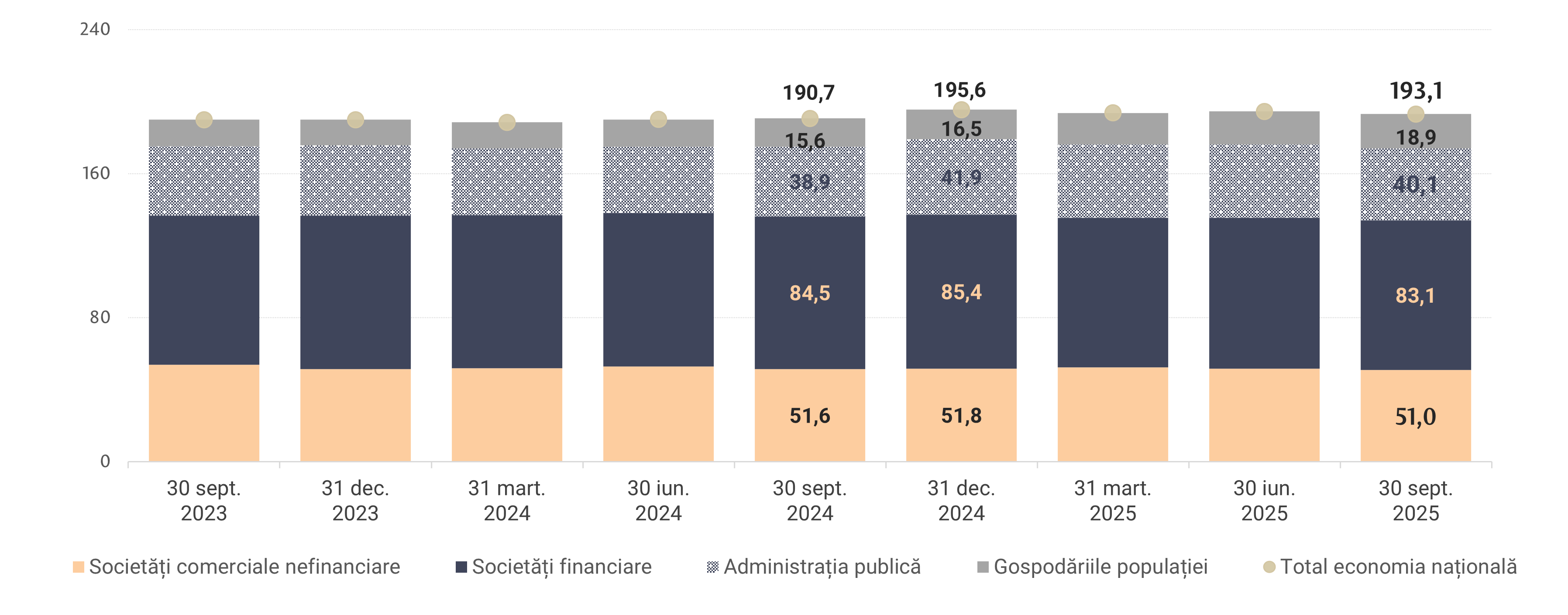 Datoria totală6 a economiei naționale a însumat 667,5 mld. lei (+5,4 la sută comparativ cu situația din 31.12.2024). Ponderea cea mai mare a datoriei totale revine sectorul financiar, (287,1 mld. lei sau 43,0 la sută din total) fapt corelat cu rolul său de intermediere financiară în economie. Sectorului societăților comerciale nefinanciare îi revin 176,2 mld. lei sau 26,4 la sută din totalul datoriei, iar sectoarelor administrației publice și gospodăriilor populației 138,6 mld. lei (20,8 la sută) și 65,4 mld. lei (9,8 la sută), respectiv.