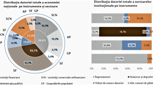 În trimestrul I 2023, datoria totală4 pe economia națională a însumat 546 875,8 mil. lei (+1,8 la sută comparativ cu finele anului 2022). Sectorul financiar, datorită funcțiilor sale de intermediar financiar, reprezintă sectorul cu cea mai mare datorie totală (42,8 la sută din totalul datoriei pe economia națională). Sectorului societăților comerciale nefinanciare îi revine 163 313,1 mil. lei sau 29,9 la sută din totalul datoriei, iar sectoarelor administrației publice și gospodăriilor populației – 110 283,0 mil. lei și 39 358,0 mil. lei, ceea ce constituie 20,2 la sută și 7,2 la sută, respectiv, din totalul datoriei pe economia națională.