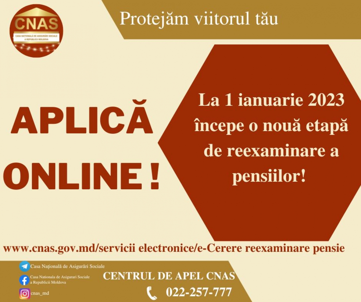 Cererea în formă electronică poate fi depusă prin intermediul paginii web oficiale a CNAS www.cnas.gov.md și portalului guvernamental unic al serviciilor publice www.servicii.gov.md, fiind necesar de a introduce un minim de date de identificare: tipul pensiei care se solicită a fi reexaminată, numărul de identificare și data naşterii.