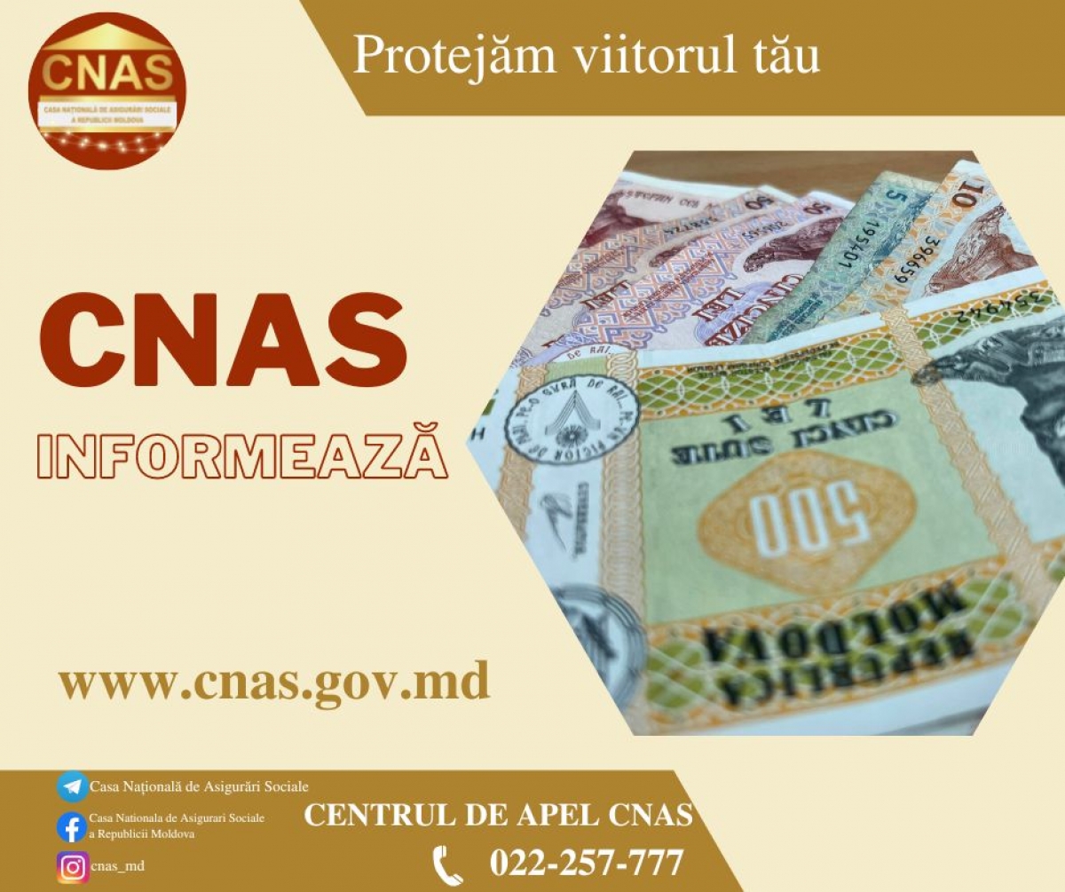 Pentru a fi la curent cu informații privind stabilirea, calcularea şi plata prestațiilor sociale, puteți accesa pagina web oficială www.cnas.gov.md, urmări postările noastre pe Facebook, Instagram și Telegram, dar și contacta Centrul de Apel al CNAS la numărul unic de telefon 022 - 257 - 777.