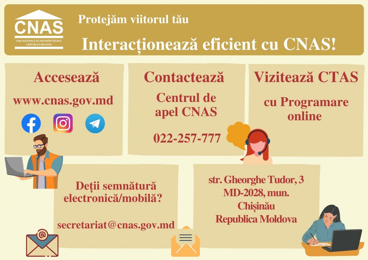 Suplimentar, cetățenii se pot informa cu privire la serviciile publice prestate de CNAS, accesând paginile CNAS pe Facebook, Telegram și Instagram, pot expedia adresări semnate electronic la adresa: secretariat@cnas.gov.md, sau pe suport de hârtie - prin intermediul oficiului poştal.