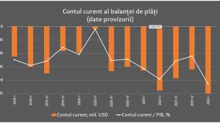 Conform datelor preliminare, în trimestrul III 2022, deficitul contului curent al balanței de plăți al Republicii Moldova a crescut cu 36,8 la sută comparativ cu cel înregistrat în perioada similară a anului precedent și a constituit 618,20 mil. USD. Raportul dintre deficitul contului curent și PIB a constituit -15,5 la sută, fiind cu 4,0 p.p. mai mare față de cel consemnat în trimestrul III 2021. Această dinamică a fost determinată de sporirea deficitului comerțului exterior cu bunuri, precum și de scăderea soldului pozitiv al balanței veniturilor primare. În același timp, balanța comerțului exterior servicii și cea a veniturilor secundare s-au îmbunătățit.