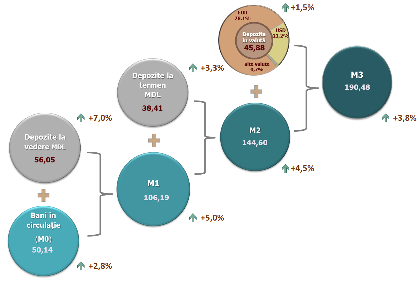 Soldul depozitelor în moneda națională a constituit 94 466,2 milioane lei, în creștere cu 4 916,5 milioane lei comparativ cu luna precedentă, reprezentând o pondere de 67,3 la sută în soldul total al depozitelor. Totodată, soldul depozitelor în valută (recalculat în lei) a constituit 45 875,6 milioane lei, în creștere cu 661,9 milioane lei comparativ cu luna precedentă, având o pondere de 32,7 la sută (diagrama 3).