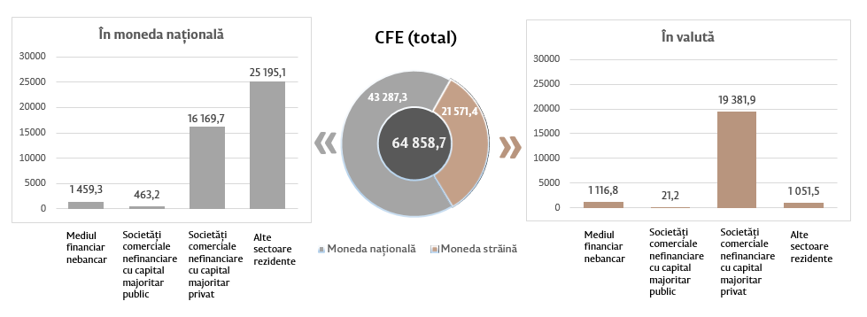 Soldul cererilor față de economie8 (diagrama 4) a constituit 64 858,7 milioane lei, micșorându-se în luna iulie 2023 comparativ cu luna iunie 2023 cu 113,6 milioane lei (-0,2 la sută), ca urmare a descreșterii cererilor față de economie în valută (exprimate în MDL) cu 205,2 milioane lei (-0,9 la sută) și a majorării cererilor față de economie în moneda națională cu 91,7 milioane lei (+0,2 la sută).