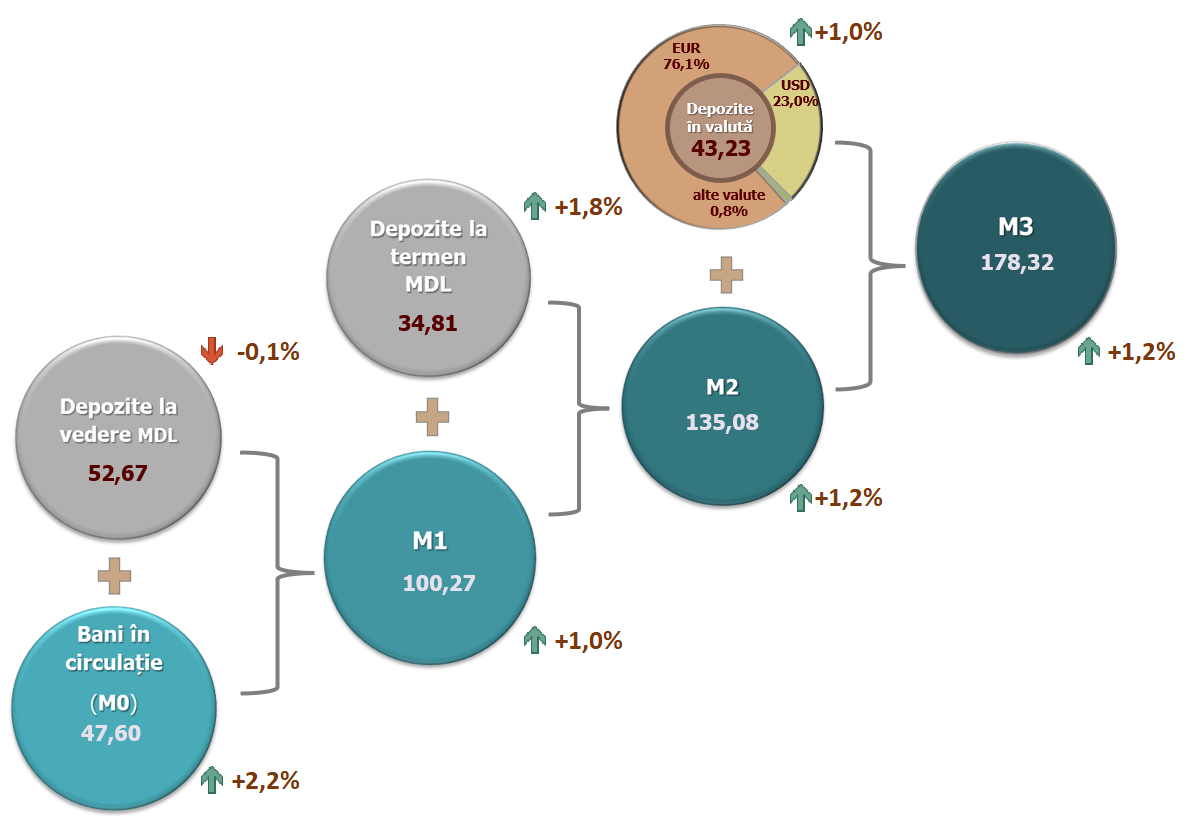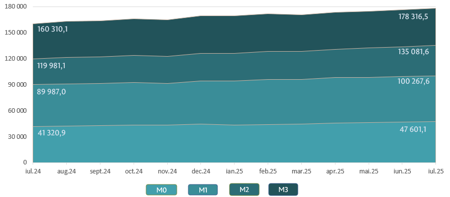 Masa monetară M36 a constituit 178 316,5 milioane lei, fiind în creștere cu 1,2 la sută față de luna iunie 2025 sau cu 11,2 la sută față de perioada similară a anului precedent.