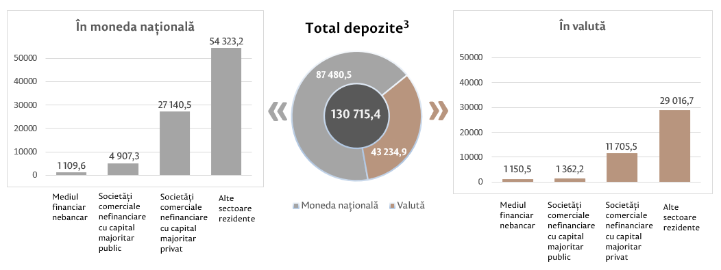 Soldul depozitelor în moneda națională s-a majorat cu 557,0 milioane lei comparativ cu luna precedentă și a constituit 87 480,5 milioane lei, reprezentând o pondere de 66,9 la sută în soldul total al depozitelor. Totodată, soldul depozitelor în valută (recalculat în lei) s-a majorat cu 439,6 milioane lei comparativ cu luna precedentă, până la nivelul de 43 234,9 milioane lei, având o pondere de 33,1 la sută (diagrama 3).