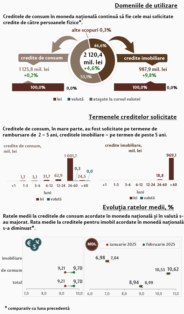 Persoanele fizice în luna februarie 2025 au contractat credite în volum de 2 120,4 milioane lei (Infografic 2), în creștere cu 4,6 la sută față de luna precedentă, partea majoră (53,1 la sută) fiind acordată pentru consum. Majoritatea creditelor de consum acordate persoanelor fizice (1 001,7 milioane lei) au fost acordate în moneda națională pe termene de la 2 până la 5 ani.