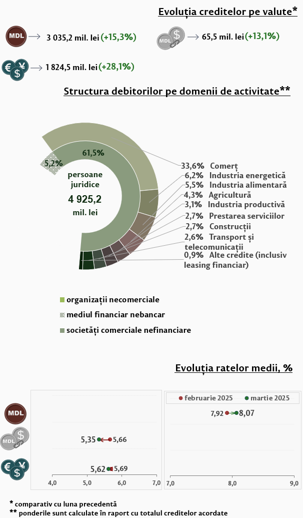 Rata medie la creditele de consum acordate în moneda națională s-a majorat cu 0,04 p.p. și a constituit 10,66 la sută. Rata medie la creditele imobiliare acordate în moneda națională s-a majorat cu 0,14 p.p., constituind 7,12 la sută.