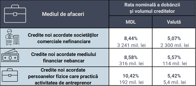Volumul creditelor noi acordate mediului de afaceri și ratele nominale ale dobânzilor aferente sunt prezentate în tabelul de mai jos.