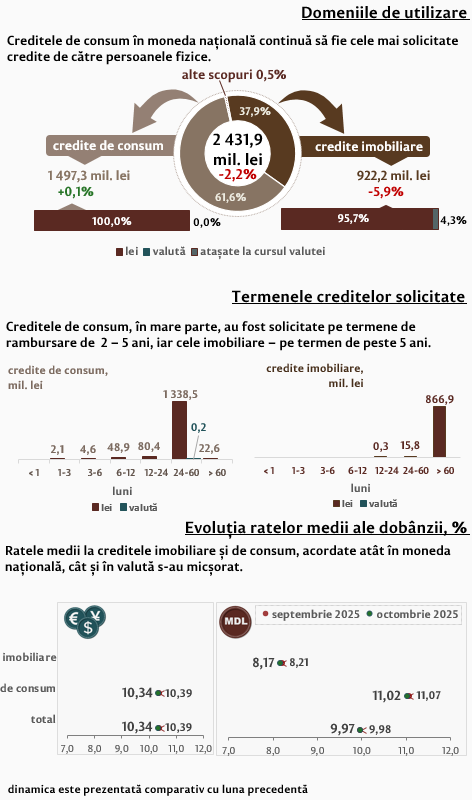 Persoanele fizice în luna octombrie 2025 au contractat credite în volum de 2 431,9 milioane lei, în descreștere cu 2,2 la sută față de luna precedentă, partea majoră (61,6 la sută) fiind acordată pentru consum (Infografic 2). Majoritatea creditelor de consum acordate persoanelor fizice (1 338,5 milioane lei) au fost acordate în moneda națională pe termene de la 2 până la 5 ani.
