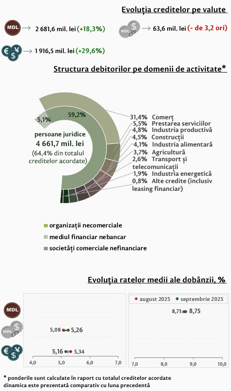 În luna septembrie 2025, creditele noi1 acordate au constituit 7 237,0 milioane lei, în creștere cu 11,7 la sută față de luna precedentă (Infografic 1). Creditele în moneda națională constituie 71,8 la sută din totalul creditelor noi acordate sau 5 199,0 milioane lei, în creștere cu 9,5 la sută față de luna august 2025.
