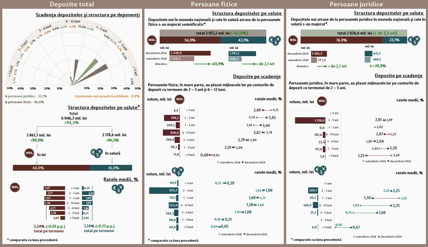 În luna decembrie 2024, depozitele noi1 atrase la termen (Infografic 1) au constituit 6 046,3 milioane lei, majorându-se cu 94,3 la sută față de luna noiembrie 2024. Depozitele atrase în moneda națională au înregistrat o pondere de 64,0 la sută și au însumat 3 867,7 milioane lei, fiind în creștere cu 98,9 la sută față de luna precedentă. Depozitele atrase în valută au totalizat 2 178,6 milioane lei, înregistrând o creștere cu 86,5 la sută față de luna precedentă. Comparativ cu luna decembrie 2023, când au fost atrase depozite noi în valoare de 5 924,6 milioane lei, creșterea în anul curent este de 2,1 la sută.
