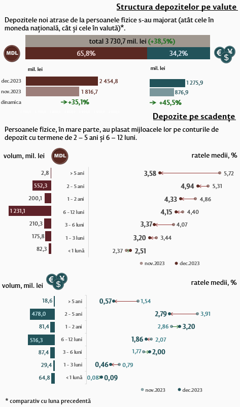 În luna noiembrie 2023, depozitele noi atrase1 la termen (Infografic 1) au constituit 3 686,8 milioane lei, majorându-se cu 11,6 la sută față de luna octombrie 2023. Depozitele atrase în moneda națională au înregistrat o pondere majoră de 67,2 la sută și au însumat 2 476,5 milioane lei, în creștere