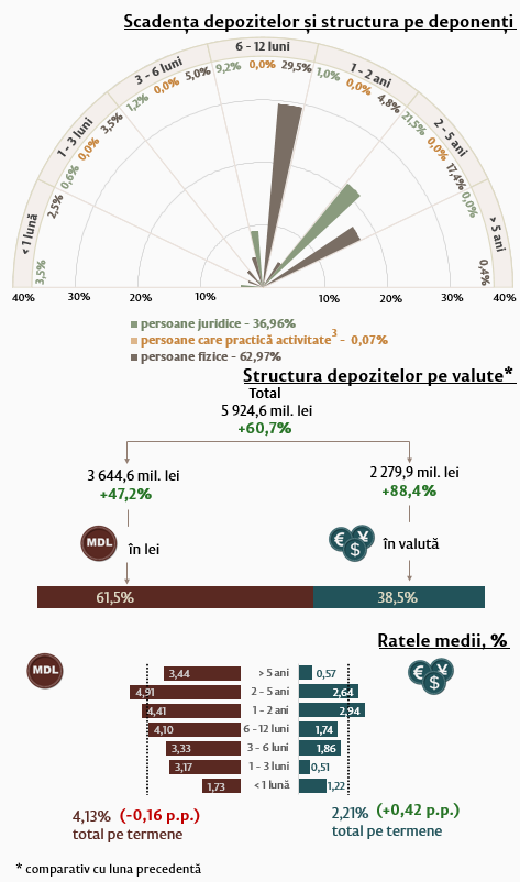 Rata medie nominală la depozitele noi atrase în moneda națională s-a micșorat cu 0,01 puncte procentuale comparativ cu luna precedentă și a constituit 4,29 la sută. Rata medie nominală la depozitele în valută s-a diminuat cu 0,17 puncte procentuale, constituind 1,79 la sută.