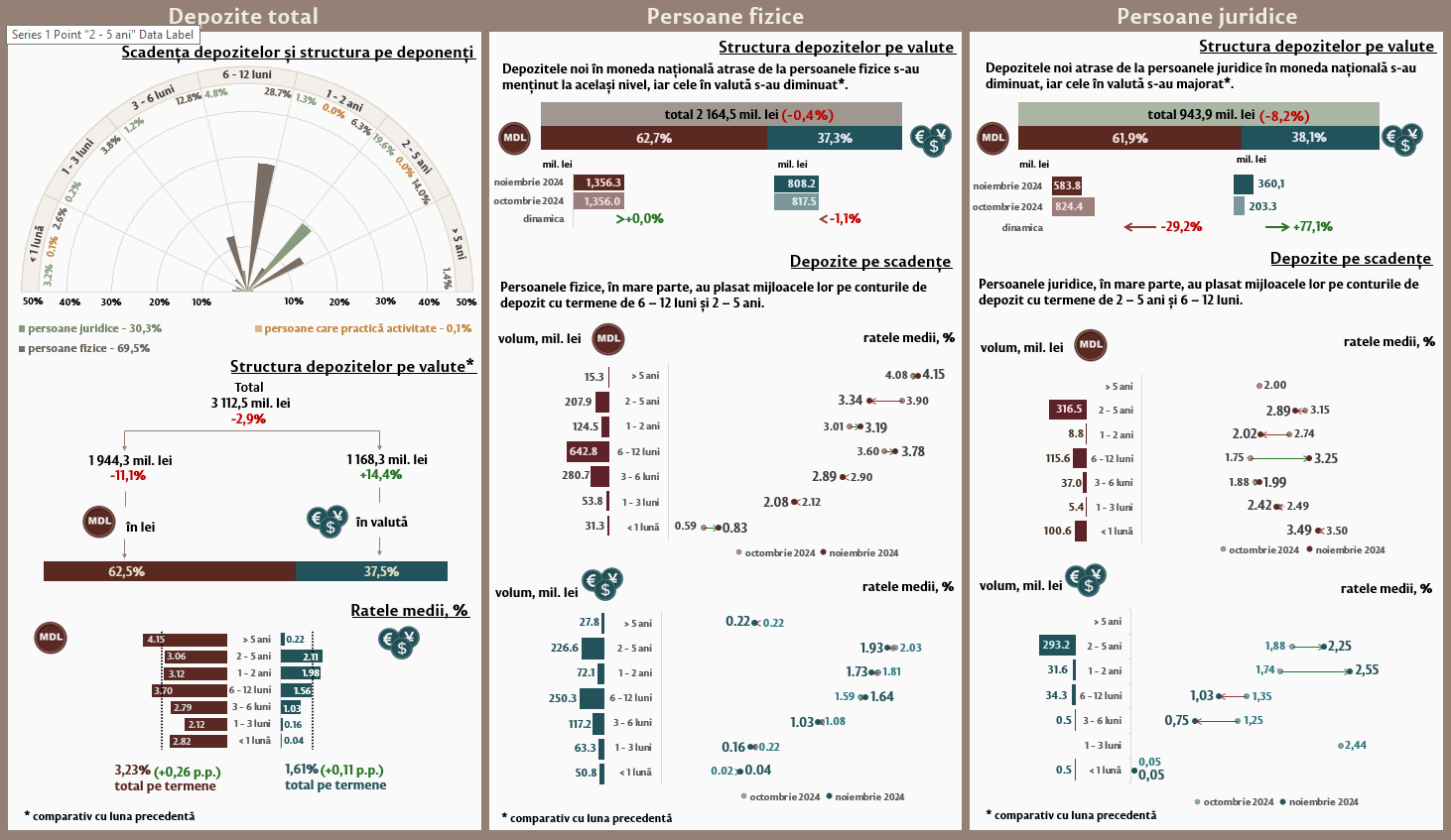 În luna noiembrie 2024, depozitele noi1 atrase la termen (Infografic 1) au constituit 3 112,5 milioane lei, micșorându-se cu 2,9 la sută față de luna octombrie 2024. Depozitele atrase în moneda națională au înregistrat o pondere de 62,5 la sută și au însumat 1 944,3 milioane lei, fiind în descreștere cu 11,1 la sută față de luna precedentă. Depozitele atrase în valută au totalizat 1 168,3 milioane lei, înregistrând o creștere cu 14,4 la sută față de luna precedentă.