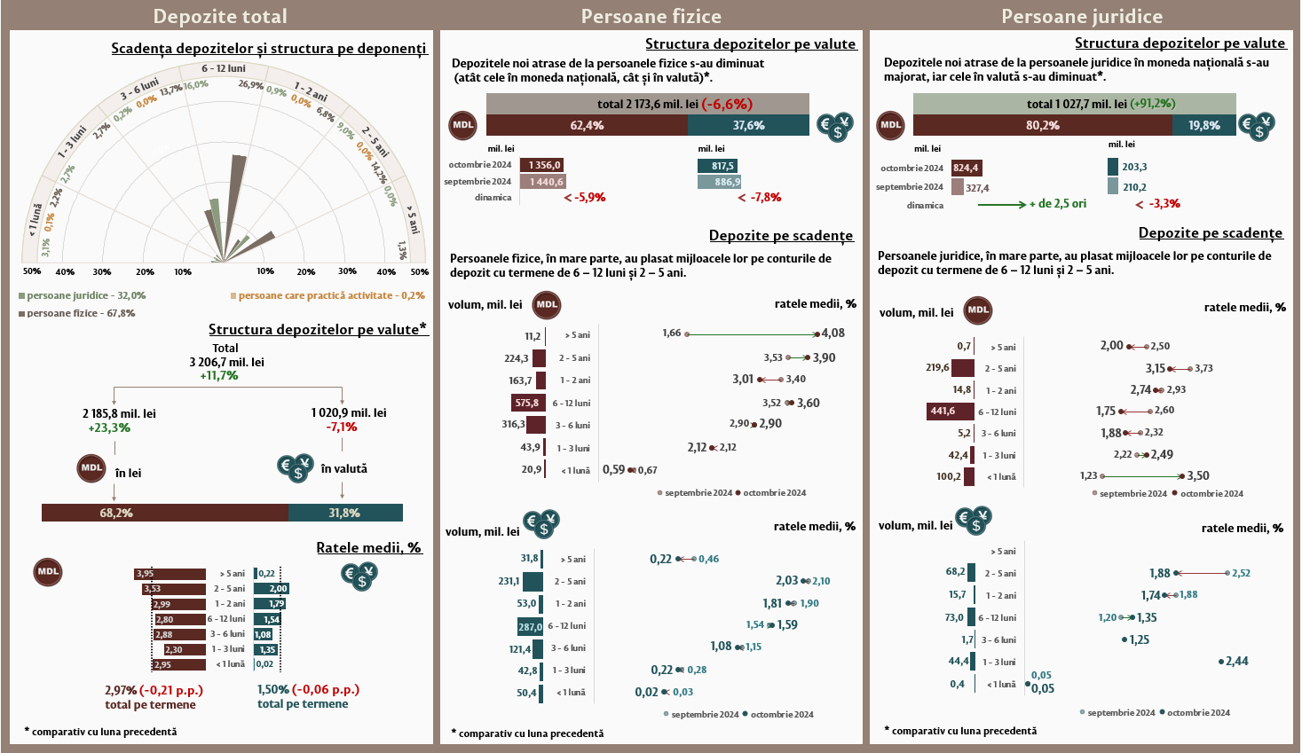 În octombrie 2024, comparativ cu luna precedentă, depozitele în moneda națională ale persoanelor juridice (Infografic 3) s-au majorat de 2,5 ori, iar cele în valută s-au diminuat cu 3,3 la sută. Depozitele în moneda națională ale persoanelor juridice au constituit 824,4 milioane lei, iar cele în valută – 203,3 milioane lei.