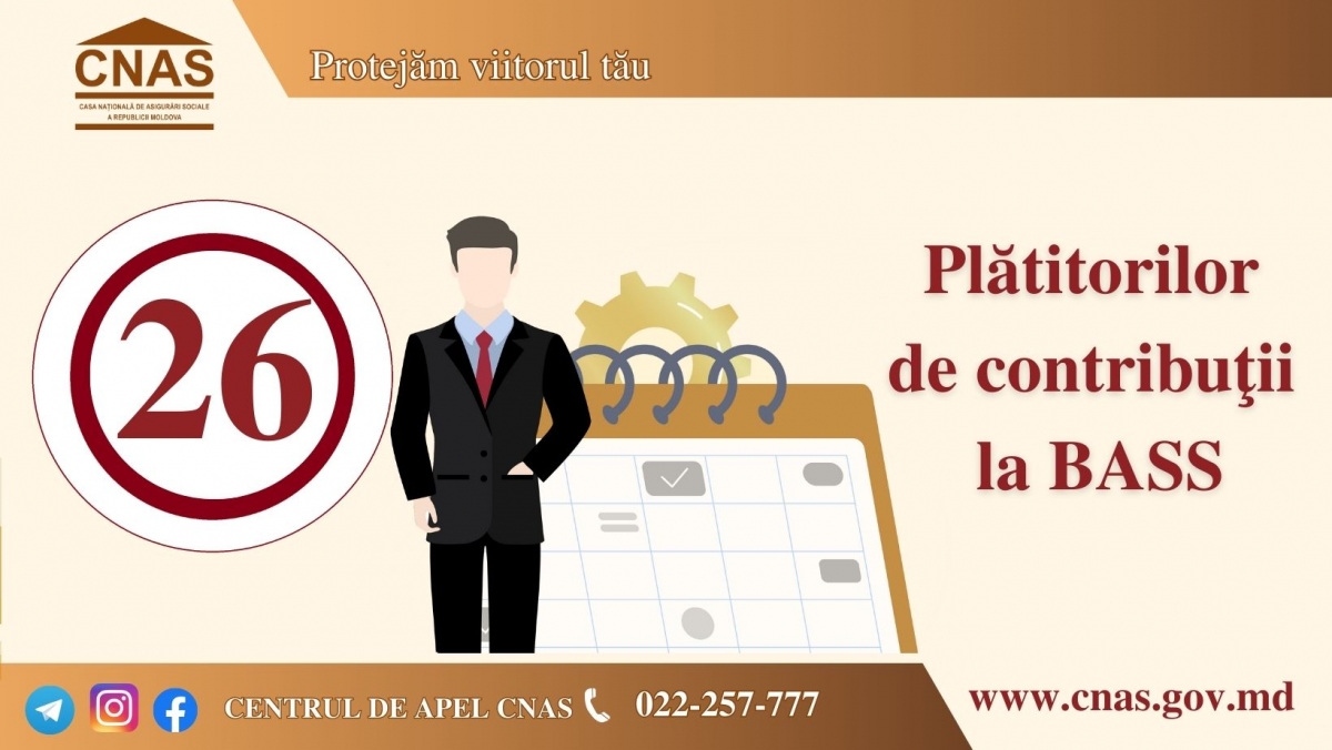Casa Naţională de Asigurări Sociale reaminteşte, că data de 26 august 2024 reprezintă termenul limită de declarare şi de plată a contribuţiilor de asigurări sociale de stat obligatorii la bugetul asigură