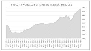 La 30 iunie 2023, activele oficiale de rezervă au constituit 4 902,67 mil. dolari SUA, în creștere cu 34,40 mil. dolari SUA în comparație cu 31 mai 2023, când acestea au însumat 4 868,27 mil. dolari SUA. Majorarea activelor oficiale de rezervă a fost determinată de: aprecierea cursurilor de s