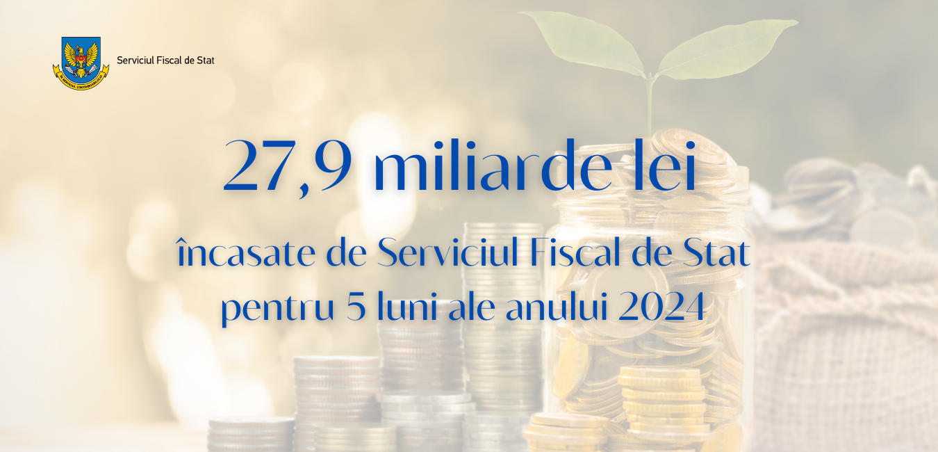 Încasările la Bugetul public național (BPN) administrate de Serviciul Fiscal de Stat, conform informațiilor operative, au constituit circa 27,9 miliarde lei în 5 luni ale anului 2024, ceea ce denotă o creștere de 2,7 miliarde lei sau cu 10,8 % în raport cu perioada similară a anului precedent.