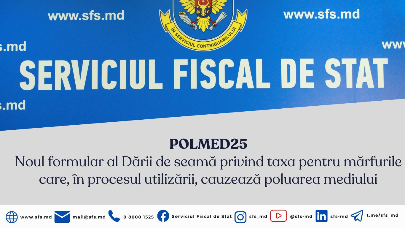 Serviciul Fiscal de Stat informează despre aprobarea noului formular al Dării de seamă privind taxa pentru mărfurile care, în procesul utilizării, cauzează poluarea mediului (POLMED25) și a Instrucțiunii de completare a acesteia, prin Ordinul Ministerului Finanțelor nr.10 din 28 ianuarie 2025. Formularul și instrucțiunea pot fi consultate pe pagina-web a SFS, la compartimentul Formulare – Persoane juridice – Plăți pentru poluarea mediului.