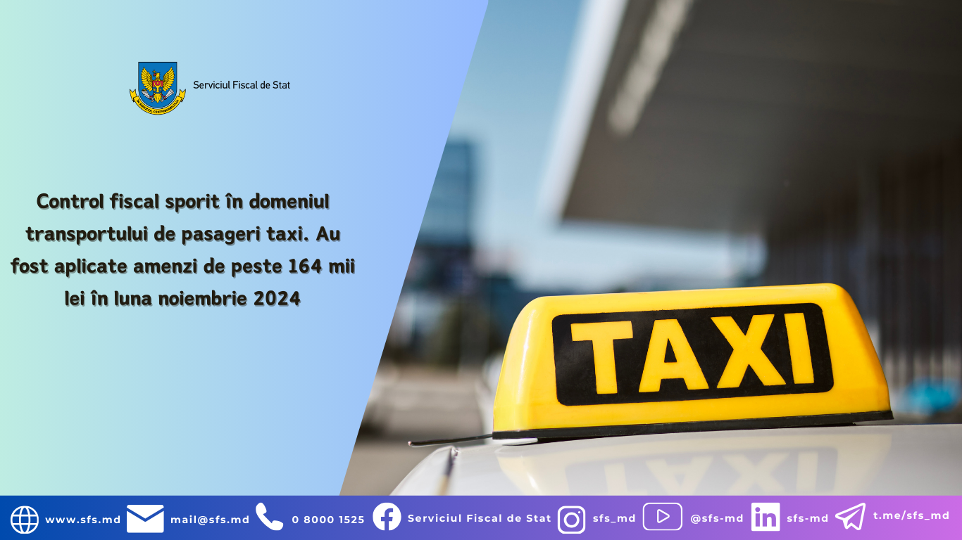 Serviciul Fiscal de Stat continuă să întreprindă măsuri riguroase pentru prevenirea și combaterea activităților economice desfășurate cu încălcarea legislației în vigoare, cu accent pe contribuabilii care activează în domeniul transportului de pasageri în regim taxi. Acțiunile