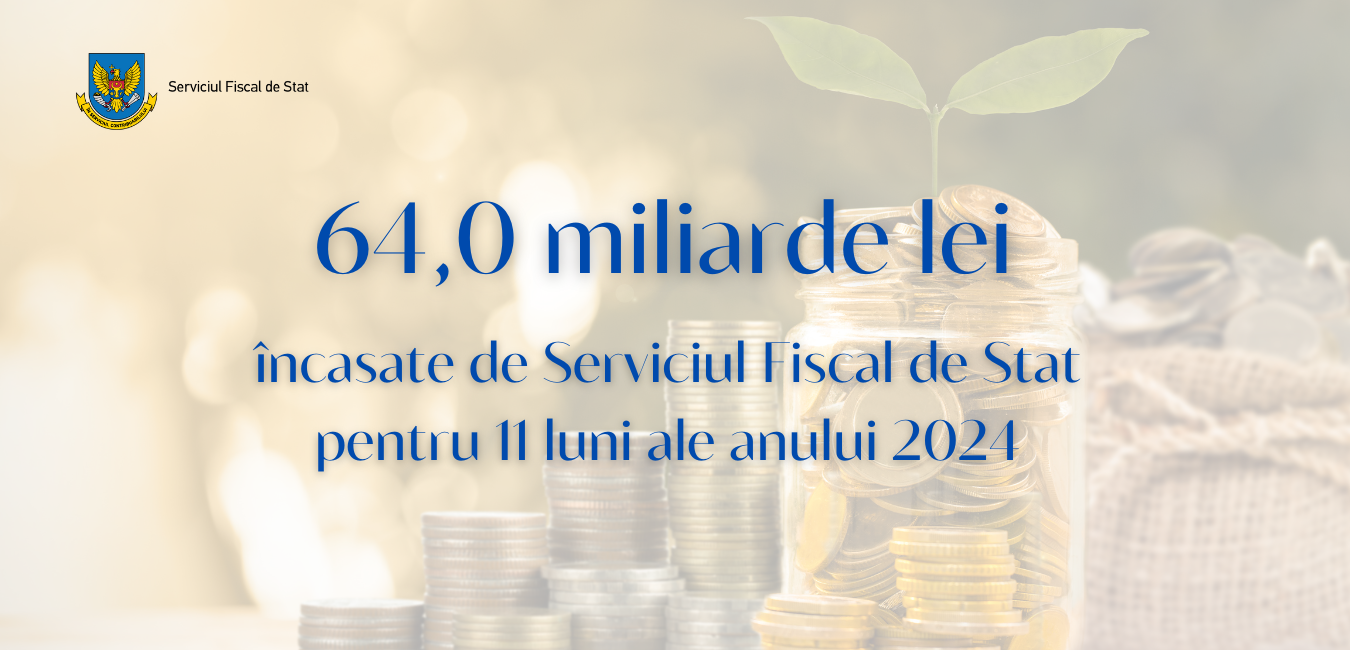 Încasările la Bugetul public național (BPN) administrate de Serviciul Fiscal de Stat, conform informațiilor operative, au constituit circa 64,0 miliarde lei în 11 luni ale anului 2024, ceea ce denotă o creștere de circa 7,1 miliarde lei sau cu circa 12,5% în raport cu perioada simil