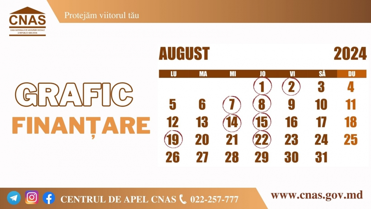 Casa Naţională de Asigurări Sociale (CNAS) anunță graficul finanțării pentru luna august. Așadar, executarea finanțării primei tranşe a pensiilor şi alocaţiilor sociale în valoare de 73 milioane lei pent