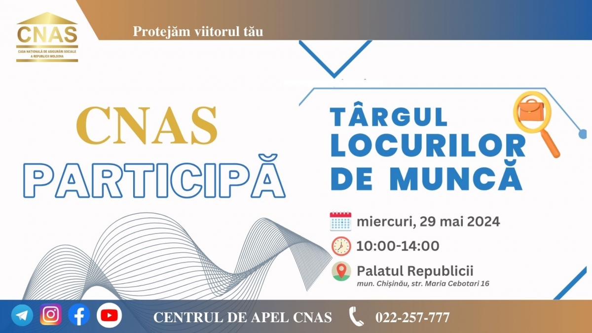 Casa Națională de Asigurări Sociale participă astăzi, 29 mai, la Târgul locurilor de muncă, organizat de Agenția Națională pentru Ocuparea Forței de Muncă, care are loc la Palatul Republicii, or. C
