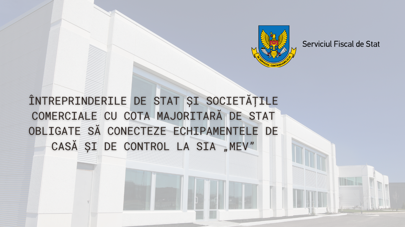Serviciul Fiscal de Stat informează că, în conformitate cu prevederile Deciziei Comisiei interdepartamentale pentru echipamente de casă și de control a Republicii Moldova nr. 26-08/5-10/02-2023 din 27.12.2023, întreprinderile de stat și societățile comerciale cu cota majoritară de s
