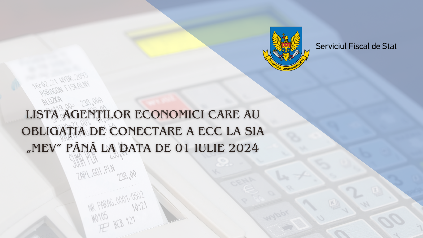 Serviciul Fiscal de Stat informează că, în conformitate cu prevederile Deciziei Comisiei interdepartamentale pentru echipamente de casă și de control a Republicii Moldova nr. 26-08/5-10/02-2023 din 27.12.2023, mai mulți agenți economici au obligația de conectare a echipamentelor de