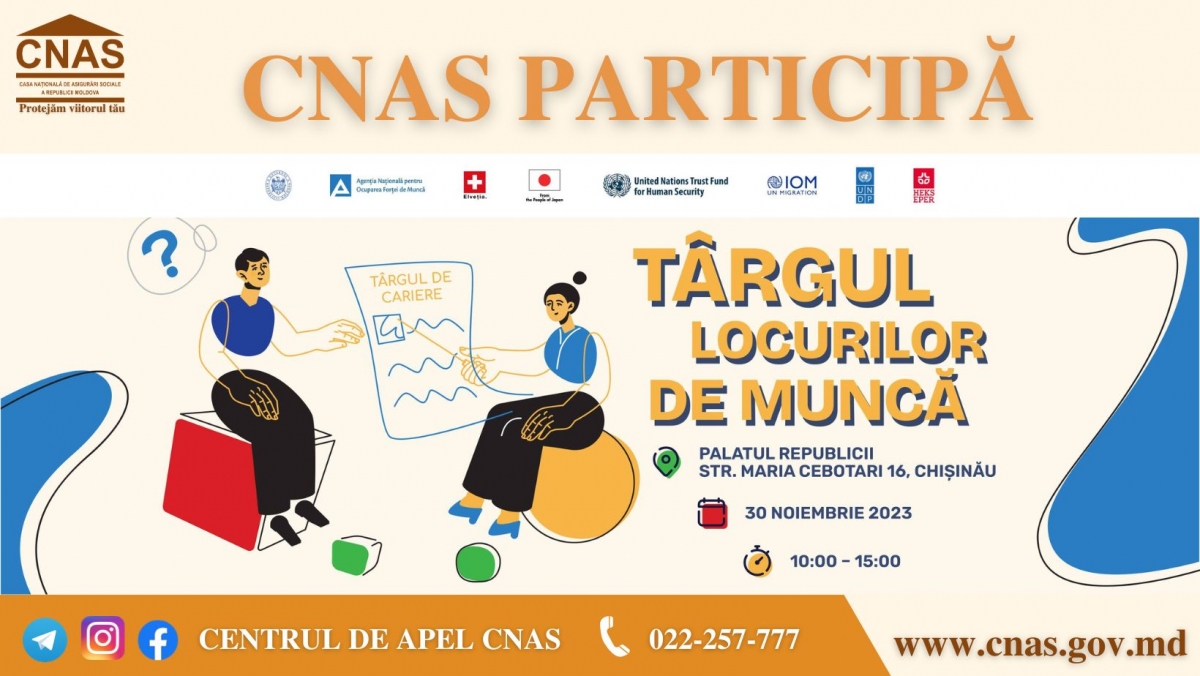 Casa Națională de Asigurări Sociale va participa joi, 30 noiembrie, la Târgul locurilor de muncă, care va avea loc în incinta Palatului Republicii (or. Chișinău, str. Maria Cebotari,16), între orel