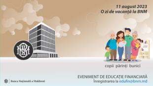 Banca Națională a Moldovei va organiza la 11 august 2023 evenimentul de educație financiară „O zi de vacanță la BNM”, pe care îl desfășoară în mod tradițional pentru publicul larg în perioada estivală. Astfel, BNM își va deschide ușile pentru copii, tineri, părinți și bunici – pentru toți cei