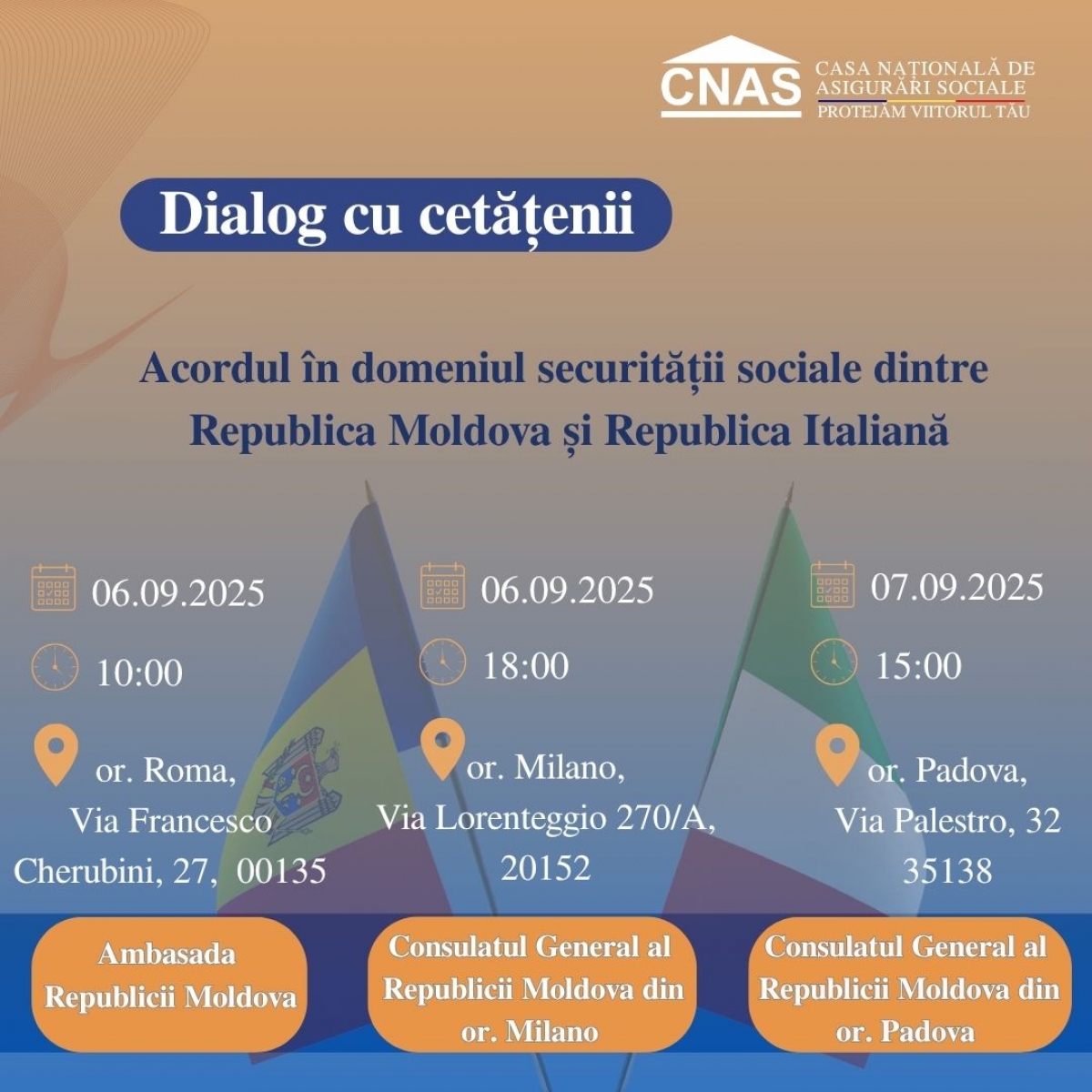 Ambasada Republicii Moldova în Republica Italiană și Casa Națională de Asigurări Sociale invită cetățenii Republicii Moldova aflați în Italia să participe la dialog organizat cu ocazia intrării în vigoar