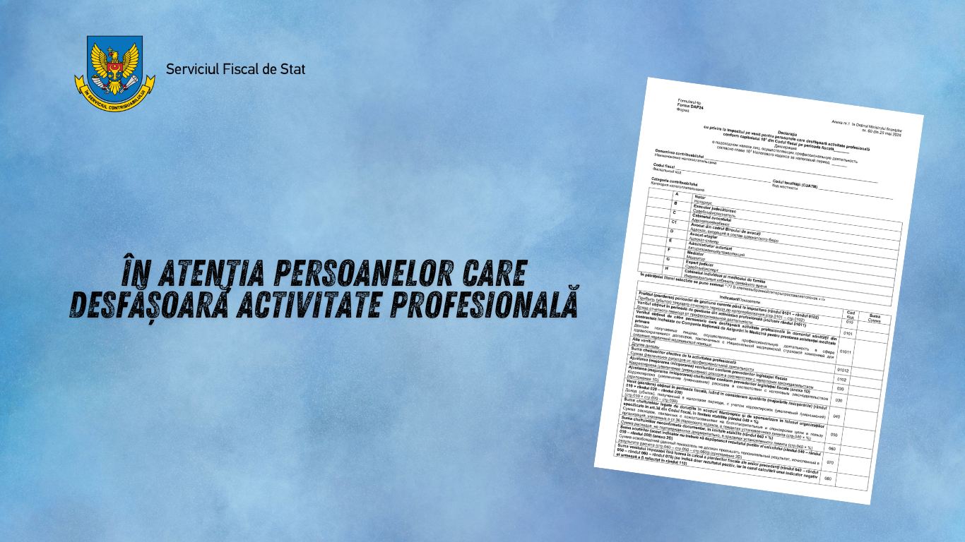 Serviciul Fiscal de Stat informează despre aprobarea noului formular cu privire la impozitul pe venit pentru persoanele care desfășoară activitate profesională (Forma DAP24) și a instrucțiunii de completare, prin Ordinul Ministerului Finanțelor nr. 60/2024, publicat în Monitorul Ofi