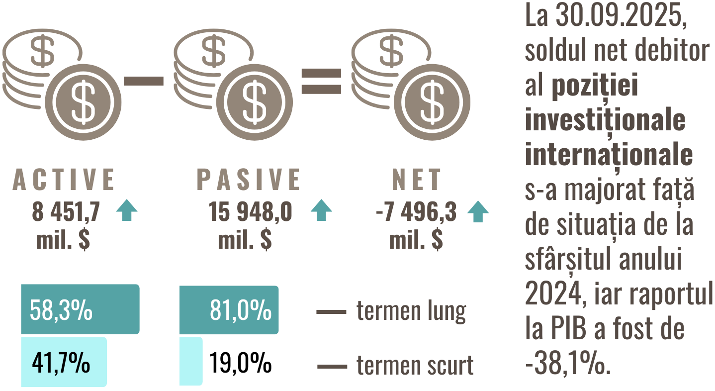 Poziția investițională internațională (PII) a Republicii Moldova, la 30.09.2025, a constituit -7 496,25 mil. USD, majorându-se cu 23,4 la sută, iar raportul dintre valoarea net debitoare a PII și PIB a constituit -38,1 la sută, fiind în creștere cu 4,7 p.p. față de situația de la sfârșitul anului 2024. Poziția activelor financiare externe a totalizat 8 451,71 mil. USD, majorându-se cu 7,5 la sută comparativ cu sfârșitul anului 2024, iar cea a pasivelor externe a însumat 15 947,97 mil. USD, în creștere cu 14,4 la sută. Raportul dintre poziția activelor și a pasivelor externe a constituit 53,0 la sută (-3,4 p.p. față de 31.12.2024).