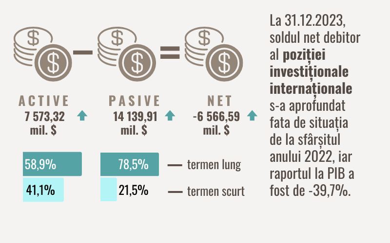 Conform datelor preliminare, poziția investițională internațională a Republicii Moldova, la 31.12.2023, a totalizat -6 566,59 mil. USD (sau -39,7 la sută raportat la PIB), soldul net debitor aprofundându-se cu 6,2 la sută, față de situația de la sfârșitul anului 2022.