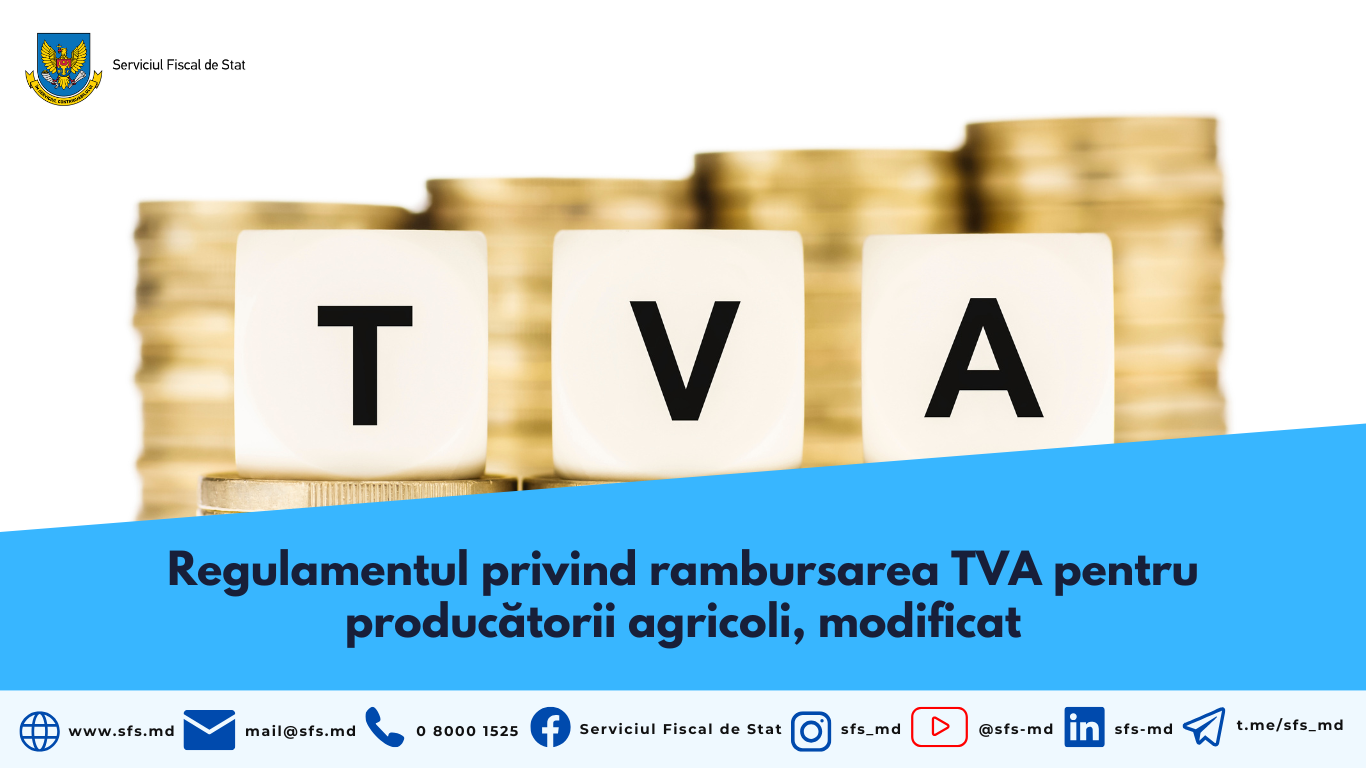 Serviciul Fiscal de Stat informează despre modificarea Regulamentului privind rambursarea TVA pentru producătorii agricoli prin Ordinul Ministerului Finanțelor nr. 40 din 20 mai 2025, în conformitate cu prevederile Legii nr. 73 din 10 aprilie 2025 prin care programul de rambursare a TVA pentru producătorii agricoli a fost extins până în luna iunie 2026.