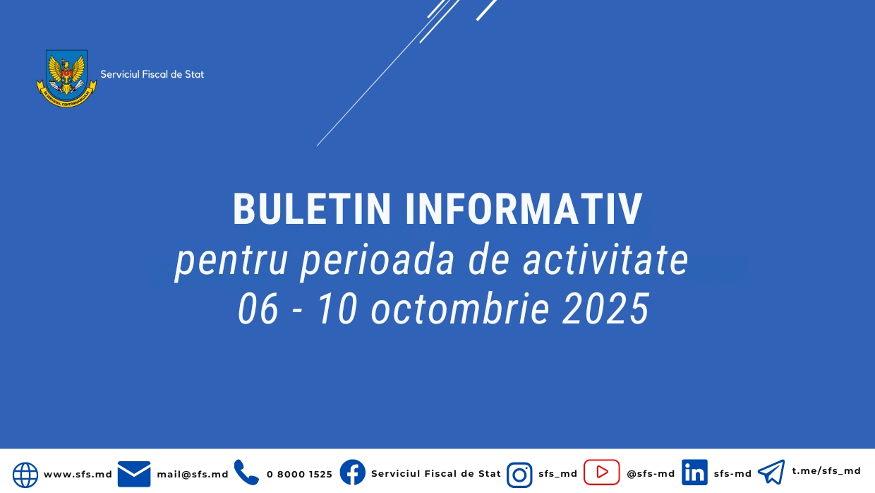 În perioada săptămânii precedente, 06 - 10 octombrie 2025, conform informațiilor operative, încasările la Bugetul public național administrate de Serviciul Fiscal de Stat constituie circa 1 miliard de lei. Autoritatea fiscală pune un accent deosebit pe promovarea conformării vo